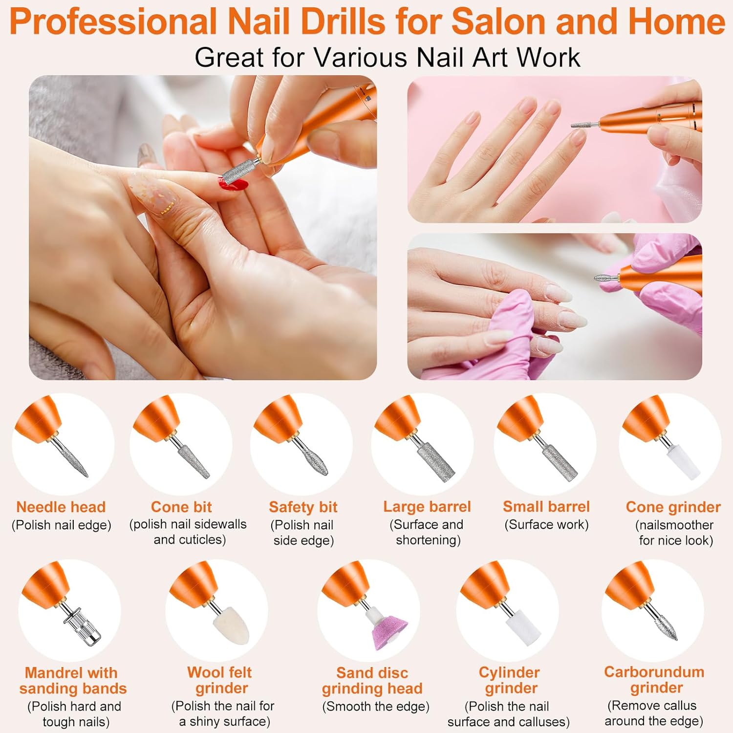 【Multifunctional Nail Drill Kit】This nail kit included 11pcs exchangeable nail drill bits and 56pcs sanding bands, perfect for grinding, sharpening, carving, engraving, routing, sanding, cutting, polishing and drilling. This e file nail drill is suitable for natural nails, gel nail polish, acrylic gel, thick nails, cuticle, dead skin. It is a nail drill set that meets all your nail beauty needs.